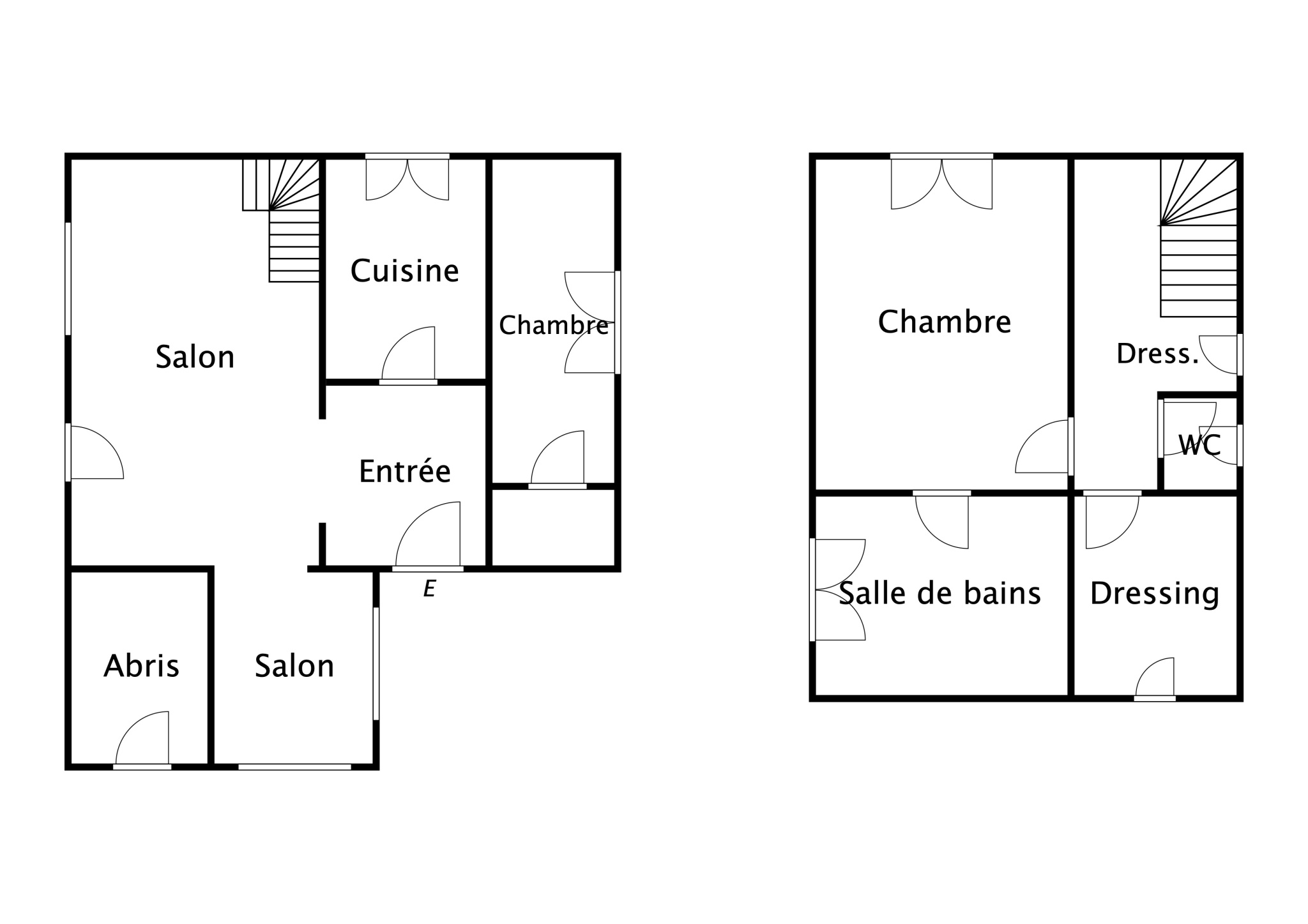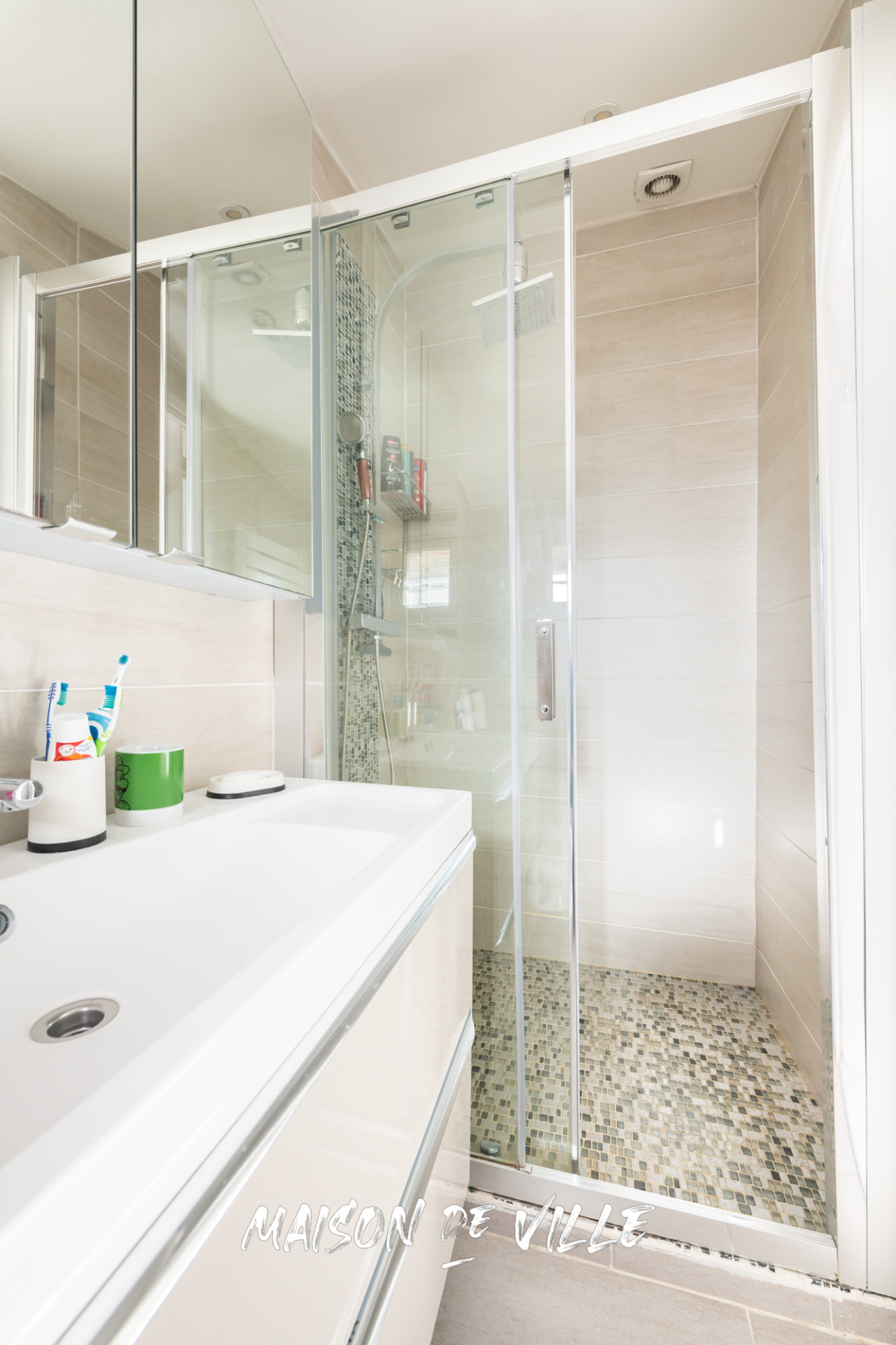 On continue la visite par l'intérieur de la maison : une belle entrée, une cuisine séparée et entièrement équipée, un double salon de plus de 40m², une chambre avec salle d'eau et wc, un dressing, une seconde chambre et une salle de bain.