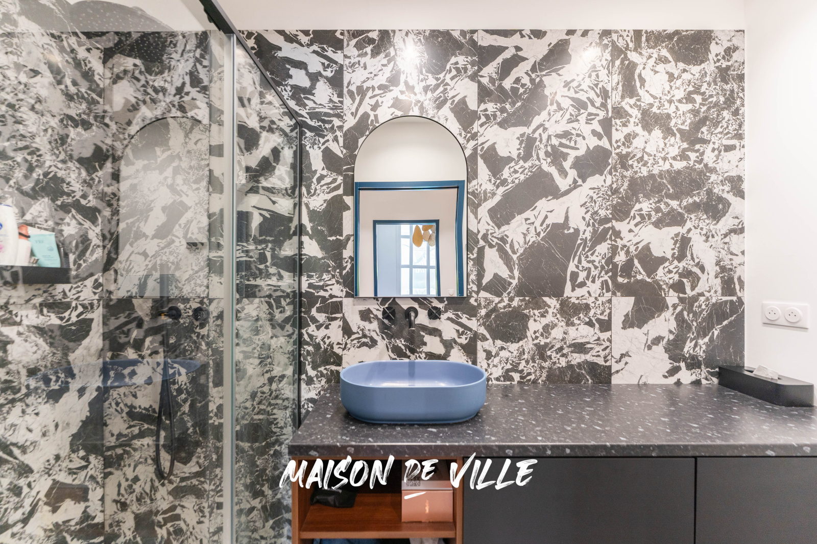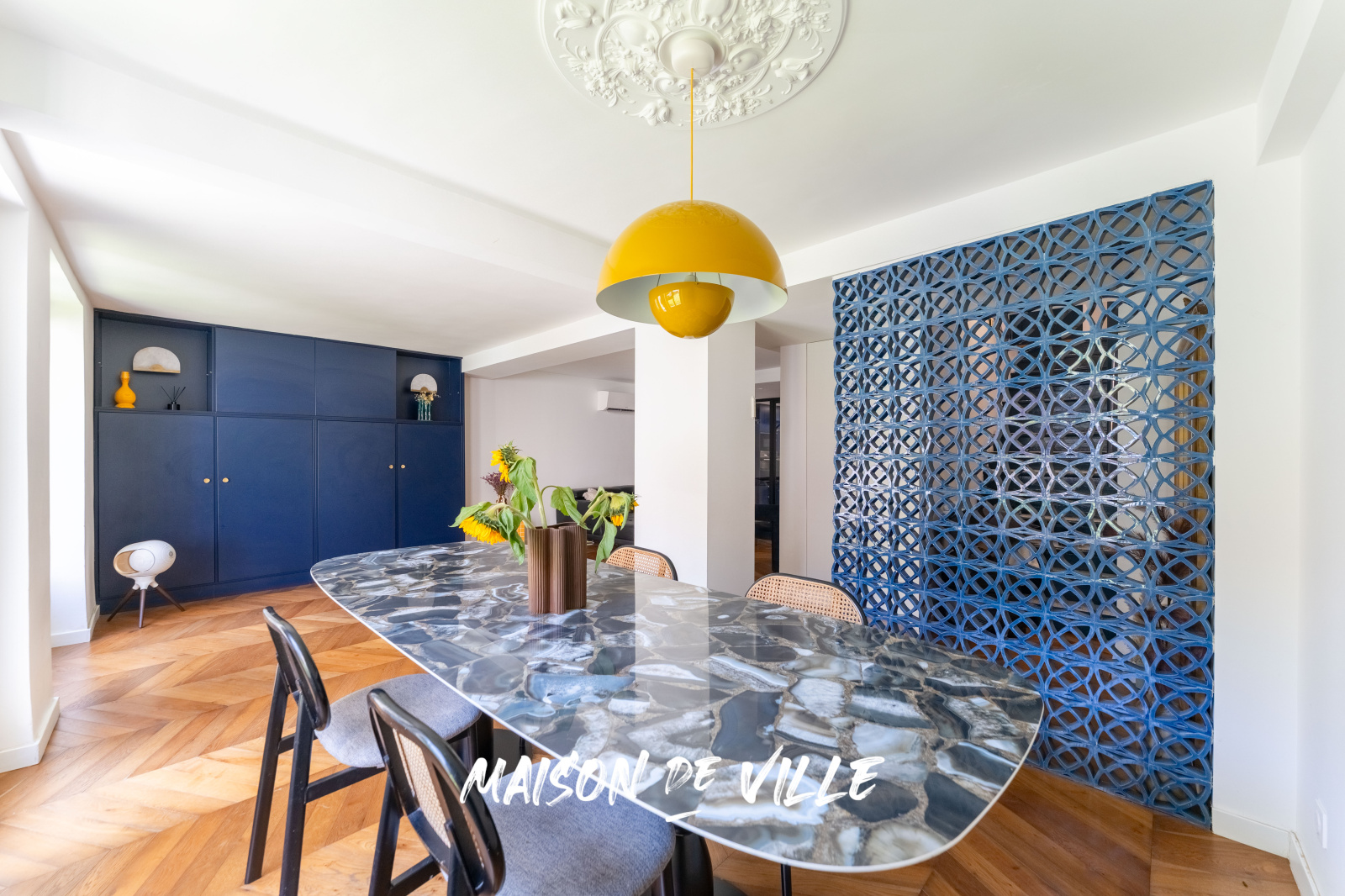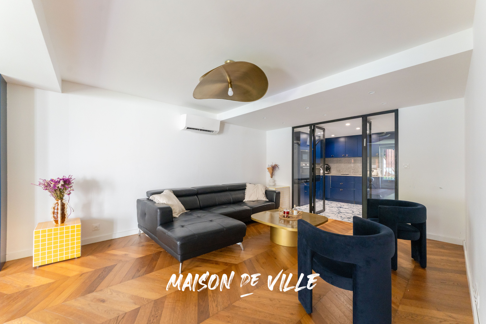 Au rez-de-jardin, un vaste salon-séjour baigné de lumière et ouvrant sur l’extérieur est prolongé par une cuisine séparée, contemporaine et élégante, coiffée de marbre.
