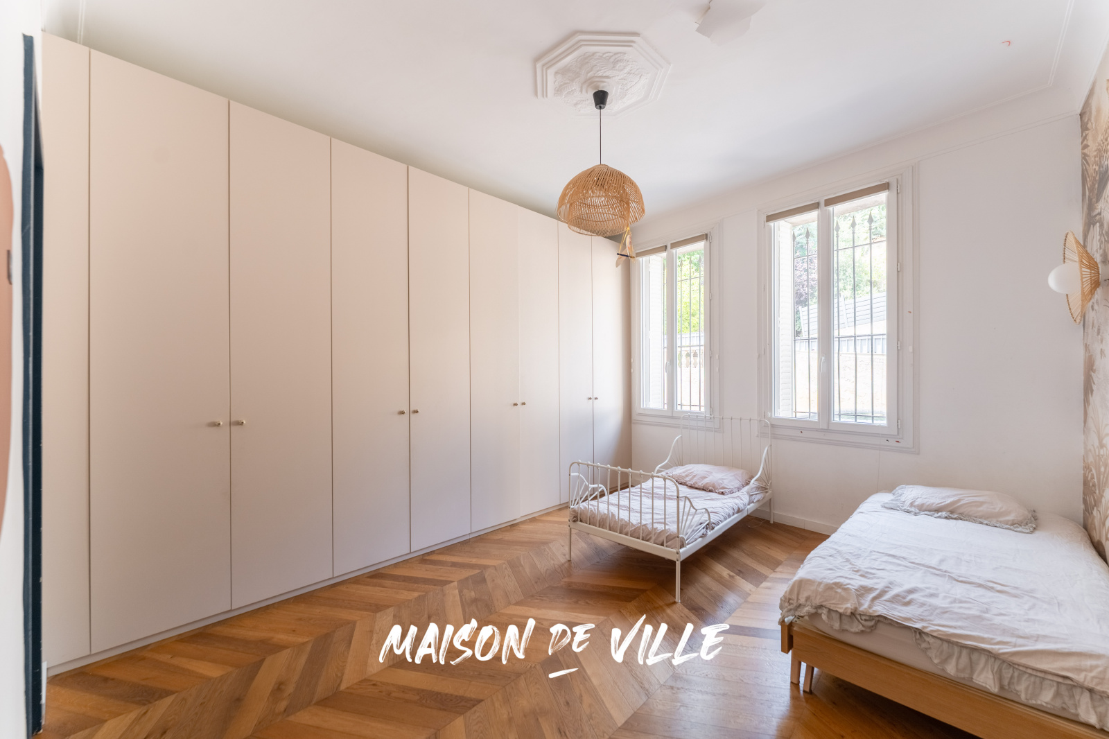 À l’étage se loge l’espace nuit composé de deux chambres avec placards, une avec une salle d'eau et l'autre avec salle de bain ainsi qu'une suite parentale avec dressing sur mesure et sa salle d'eau.