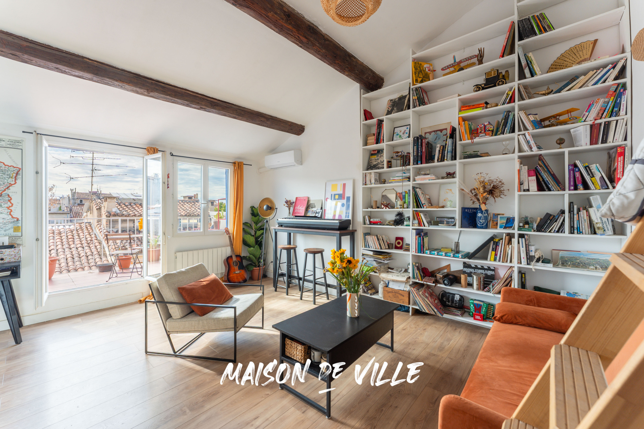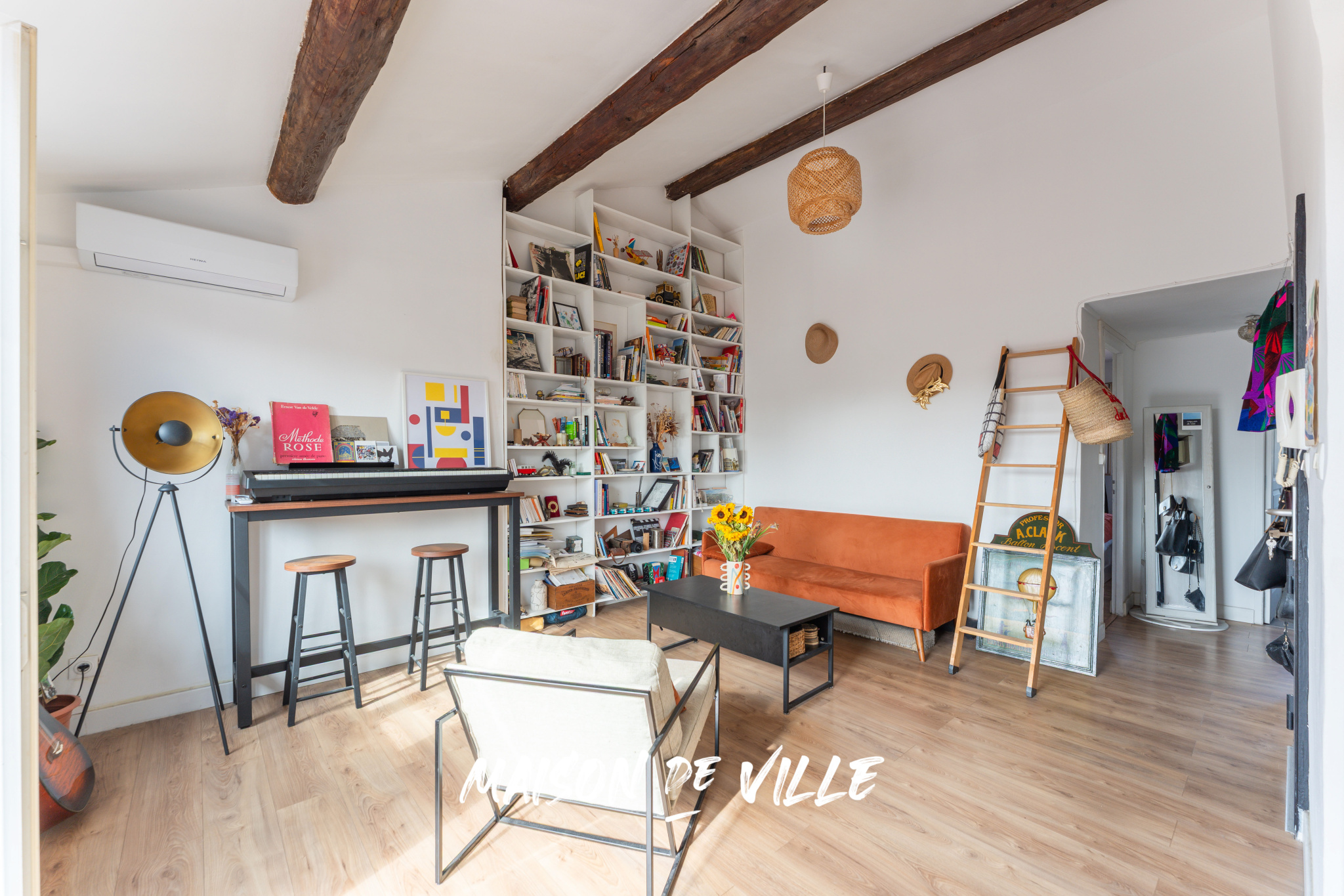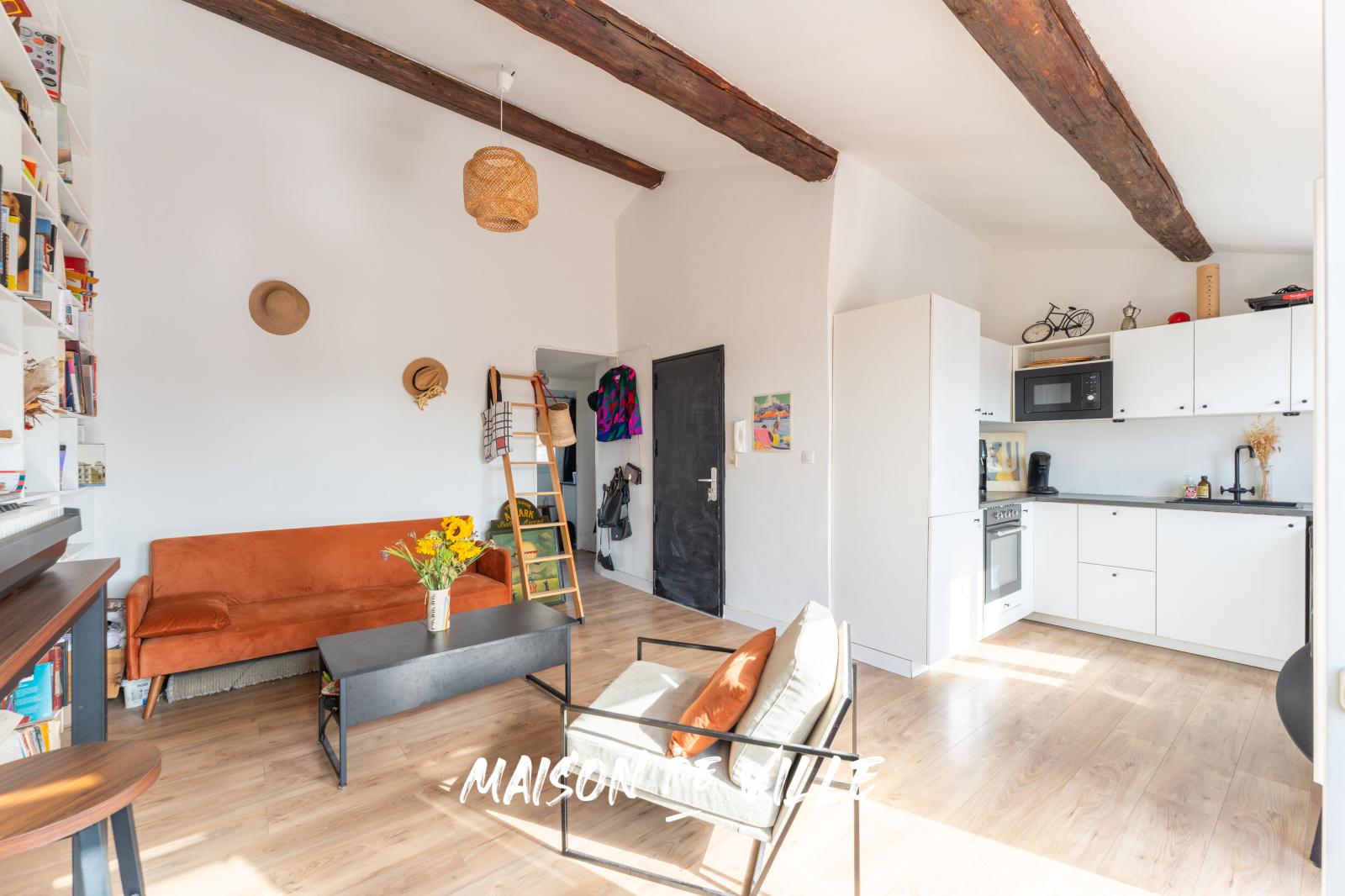 Dès l’entrée, le séjour surprend par son plafond cathédrale (plus de 3,50m sous plafond) et ses poutres apparentes, renforçant cette impression d’espace et de légèreté. Une bibliothèque sur mesure habille tout un pan de mur et donne au lieu une identité chaleureuse et unique. Epace ultra optimisé, sans perte d'espace, qui offre un séjour cuisine ouverte de plus de 25 m².