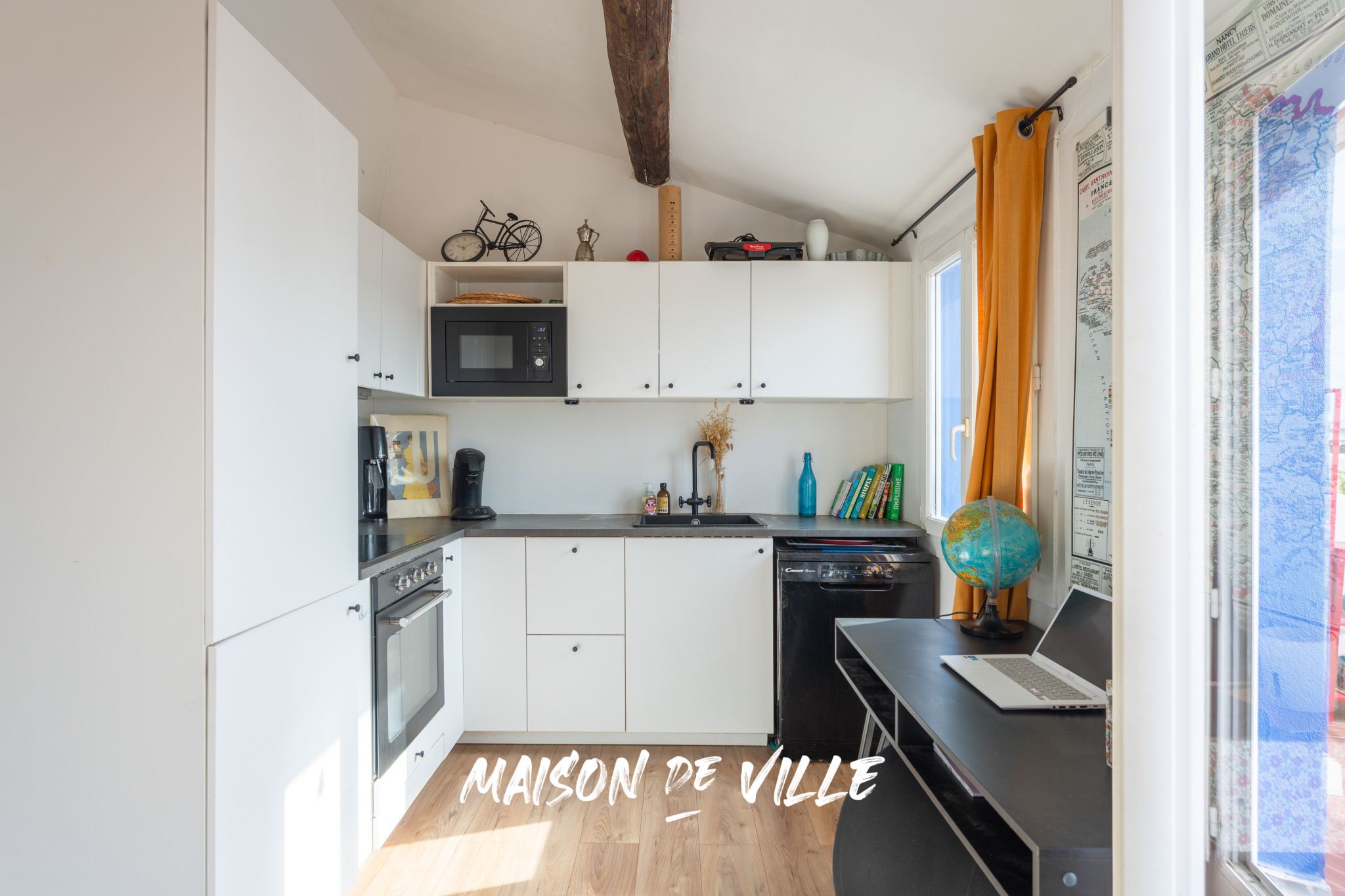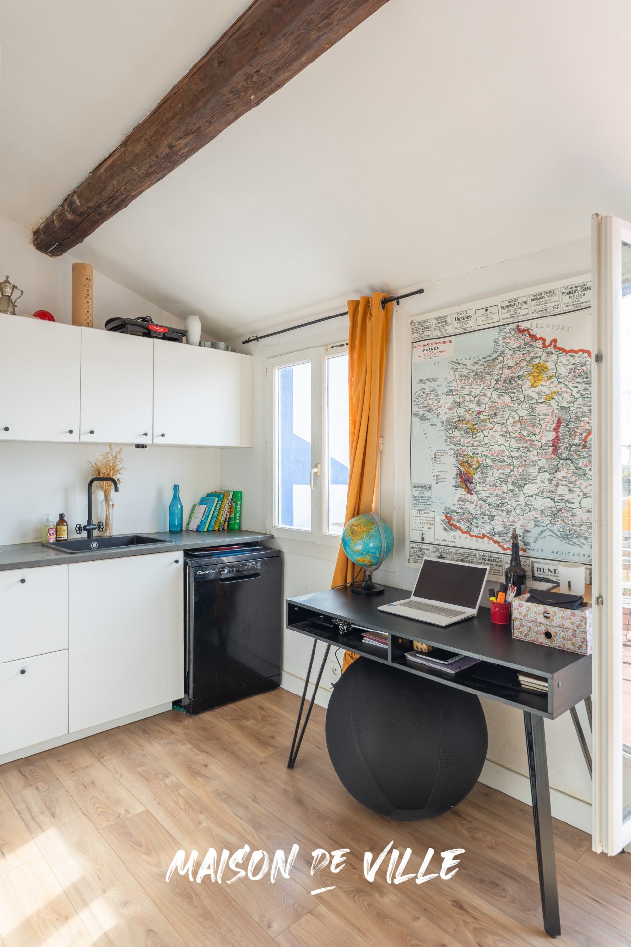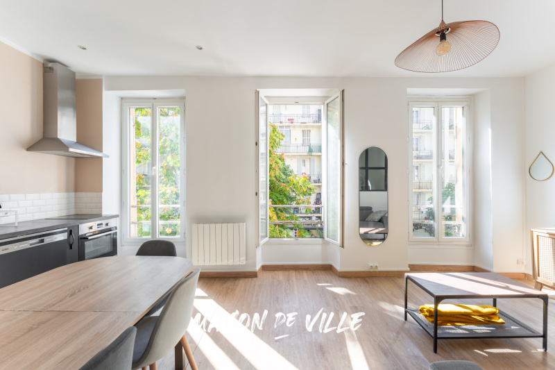 Dès l’entrée, le séjour surprend par son plafond cathédrale (plus de 3,50m sous plafond) et ses poutres apparentes, renforçant cette impression d’espace et de légèreté. Une bibliothèque sur mesure habille tout un pan de mur et donne au lieu une identité chaleureuse et unique. Epace ultra optimisé, sans perte d'espace, qui offre un séjour cuisine ouverte de plus de 25 m².