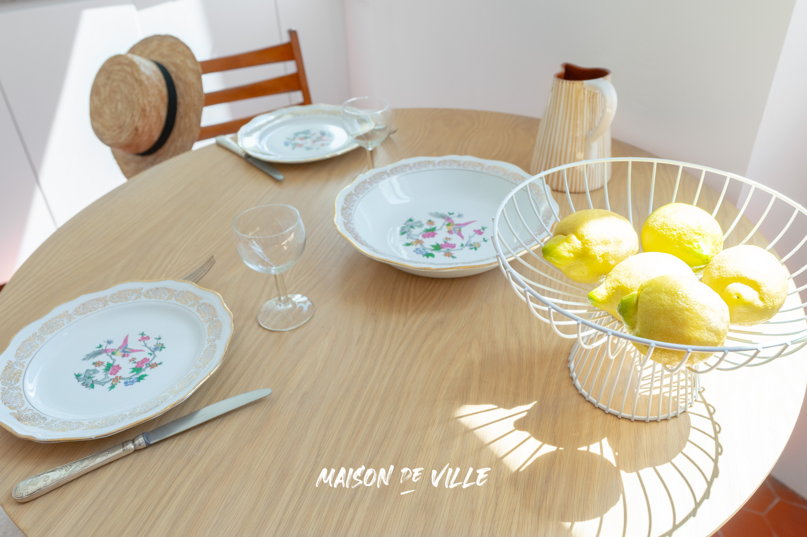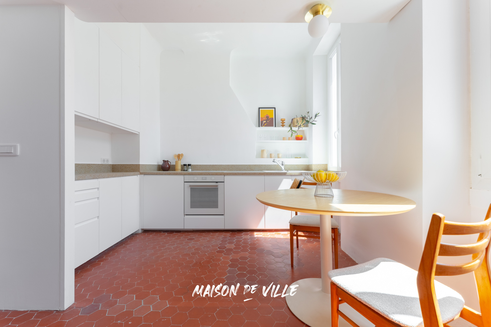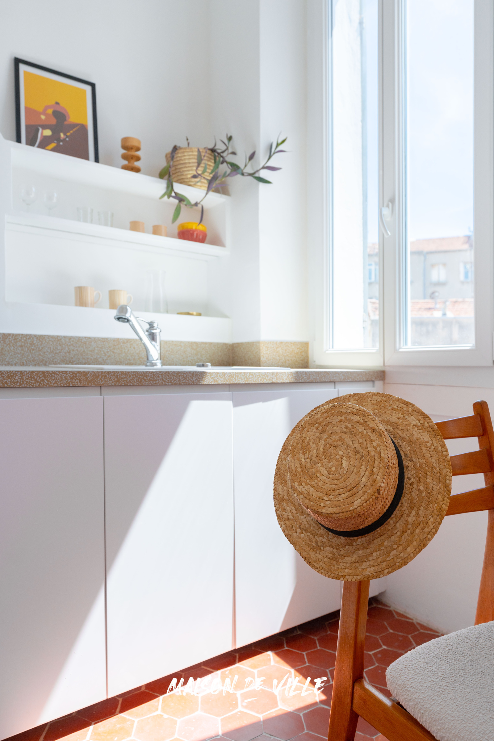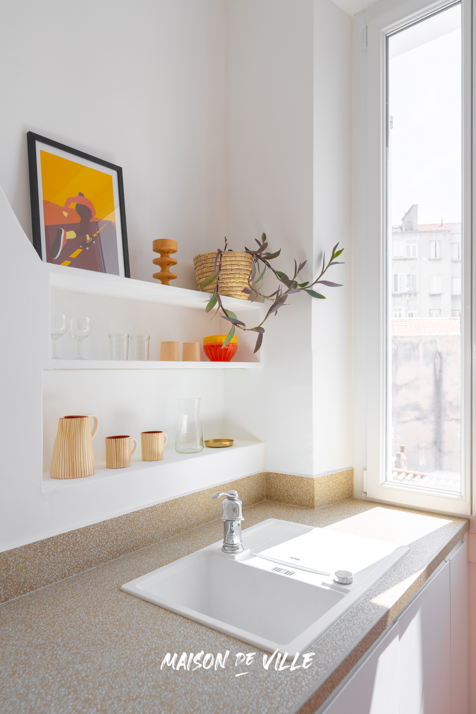 Coté cuisine, le jaune soleil. Une grande cuisine neuve et épurée dans un style méditerranéen avec son plan de travail en grès céram made in Italy effet terrazzo.De nombreux rangements, un frigo, un lave-linge, un lave-vaisselle ainsi qu’un évier et de la robinetterie haut de gamme. Une belle table et des chaises chinées relient la cuisine au salon.