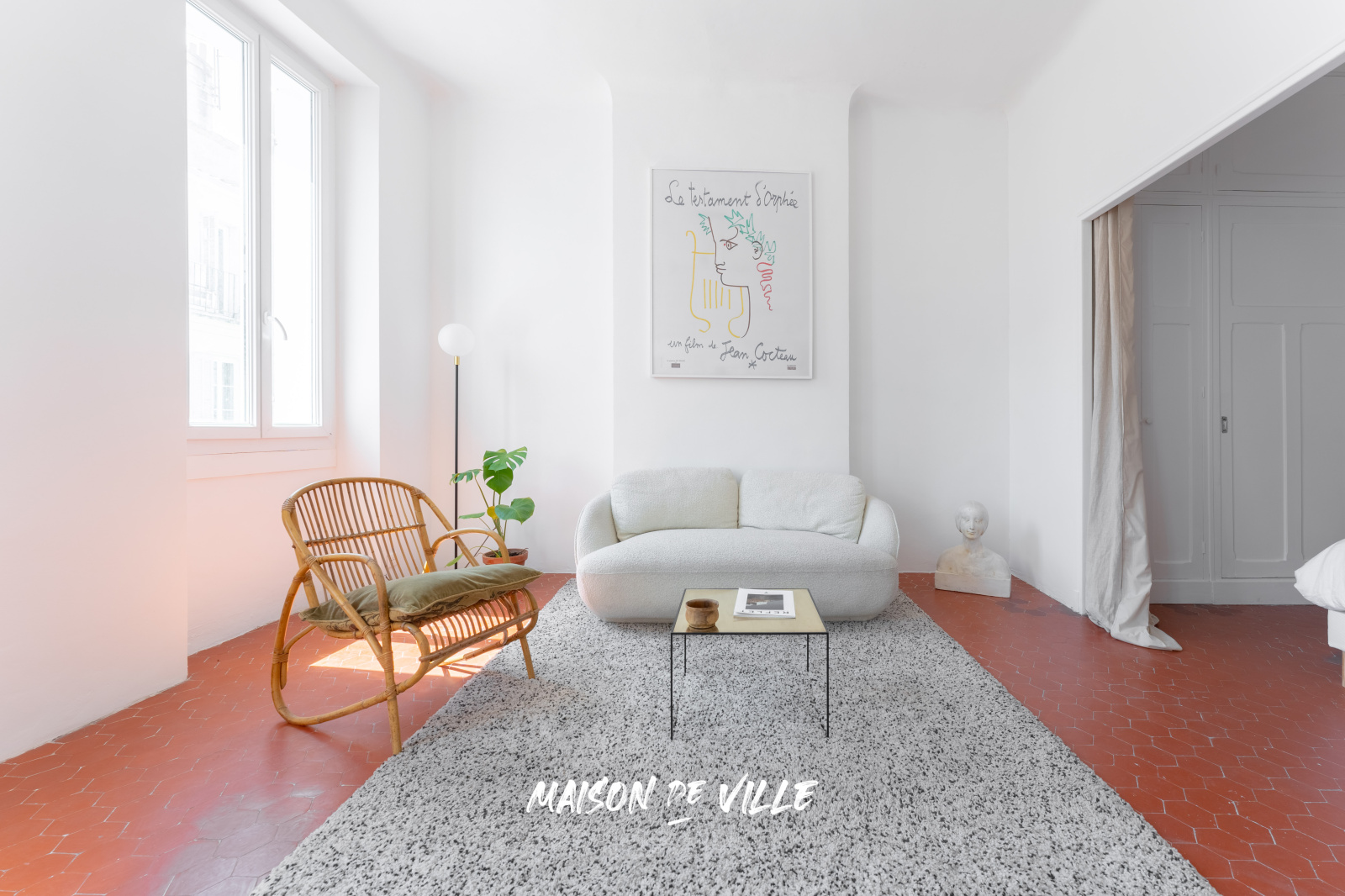Côté salon, ultra lumineux. Un grand espace ouvert entièrement décoré avec des meubles de qualité, savamment mélangés à des pièces vintages dans un esprit cosy et sophistiqué. Vous pourrez profiter du charme de l’ancien avec tomettes au sol et belle hauteur sous plafond (3m20).