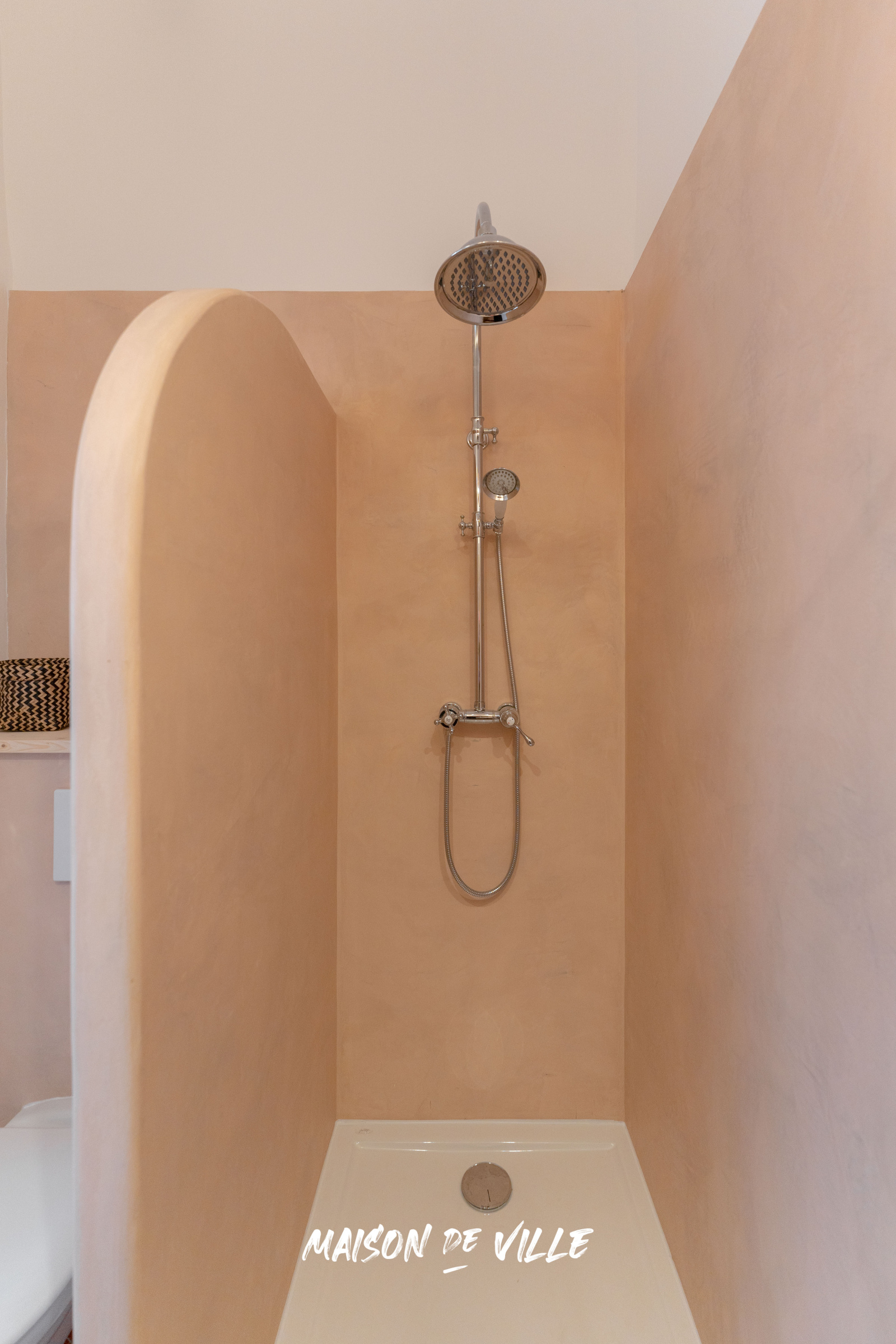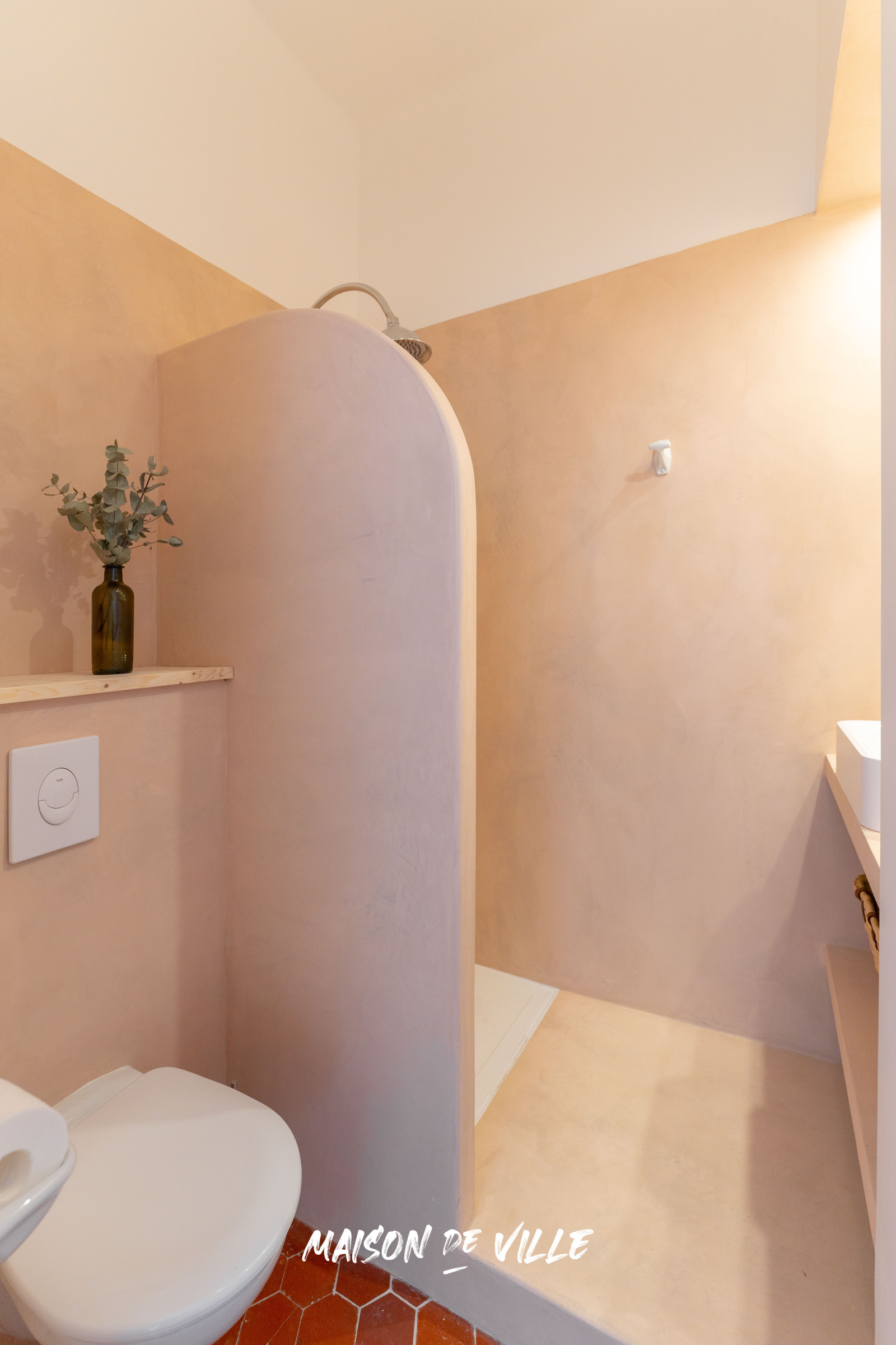 Coté salle de bain. Designée par un décorateur, cette salle de bain unique, minimaliste et douce a entièrement été conçue pour que chaque espace soit optimal. La douche à l’italienne, l’évier et les toilettes suspendues sont recouverts d’un béton ciré rosé minéral, donnant cet aspect déco tout en sobriété. La robinetterie haut de gamme souligne l’ensemble.