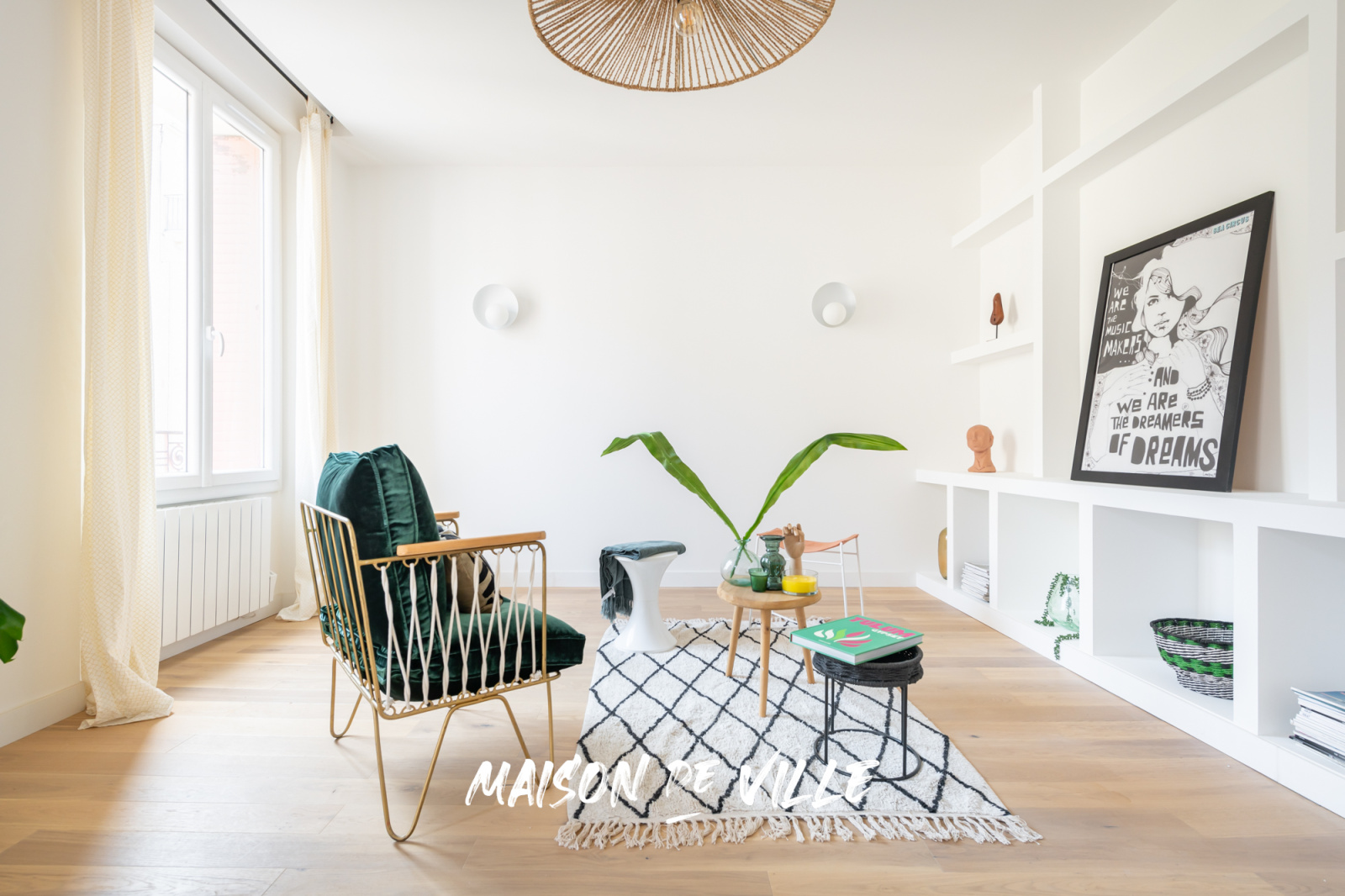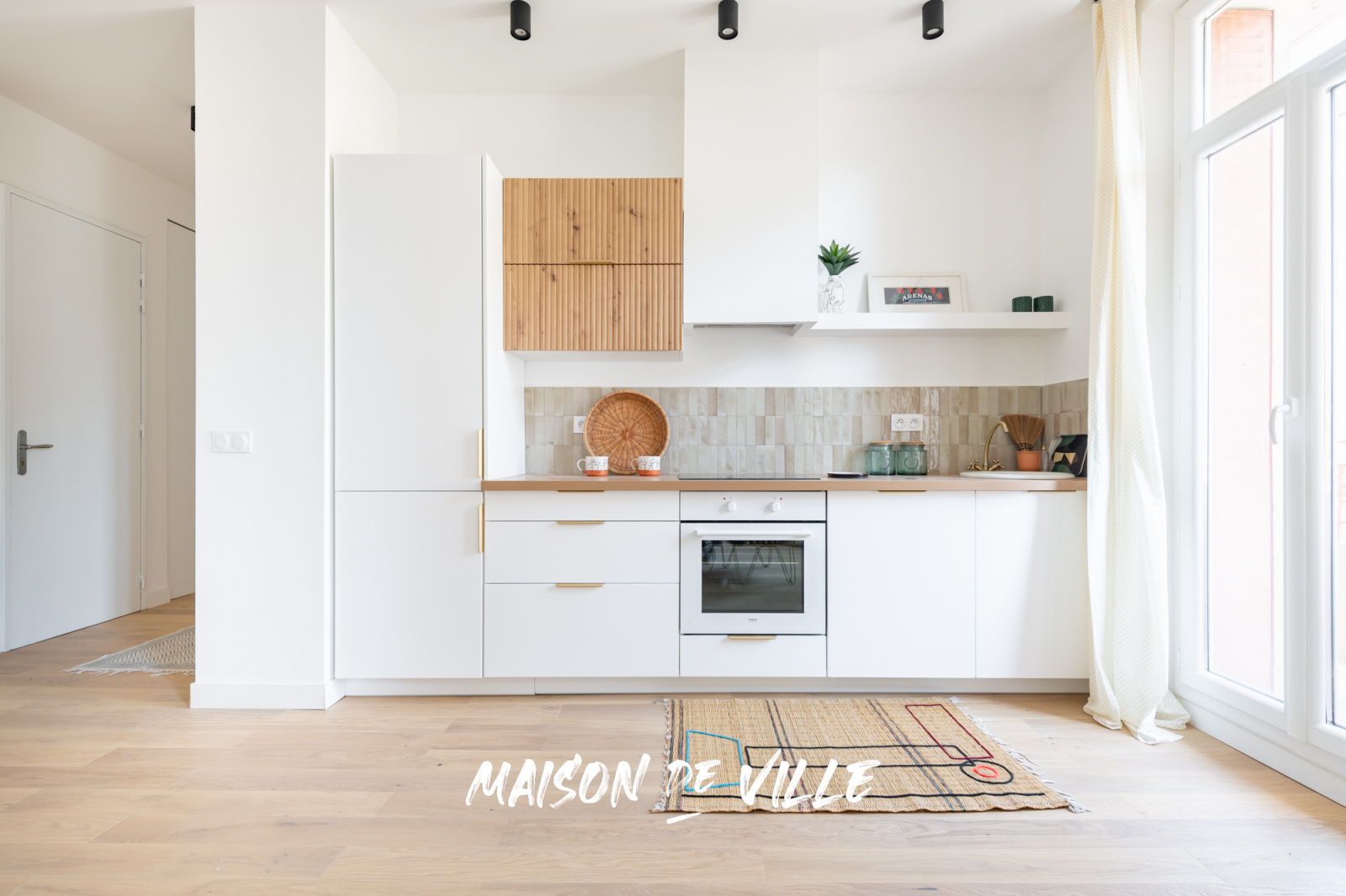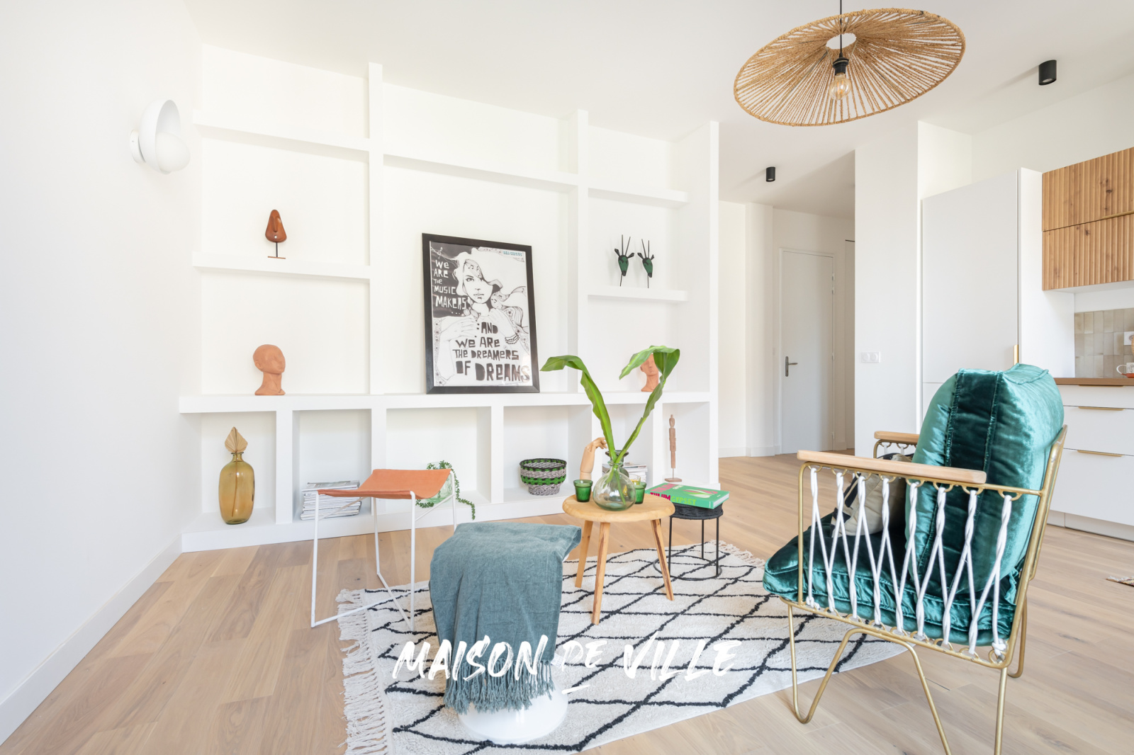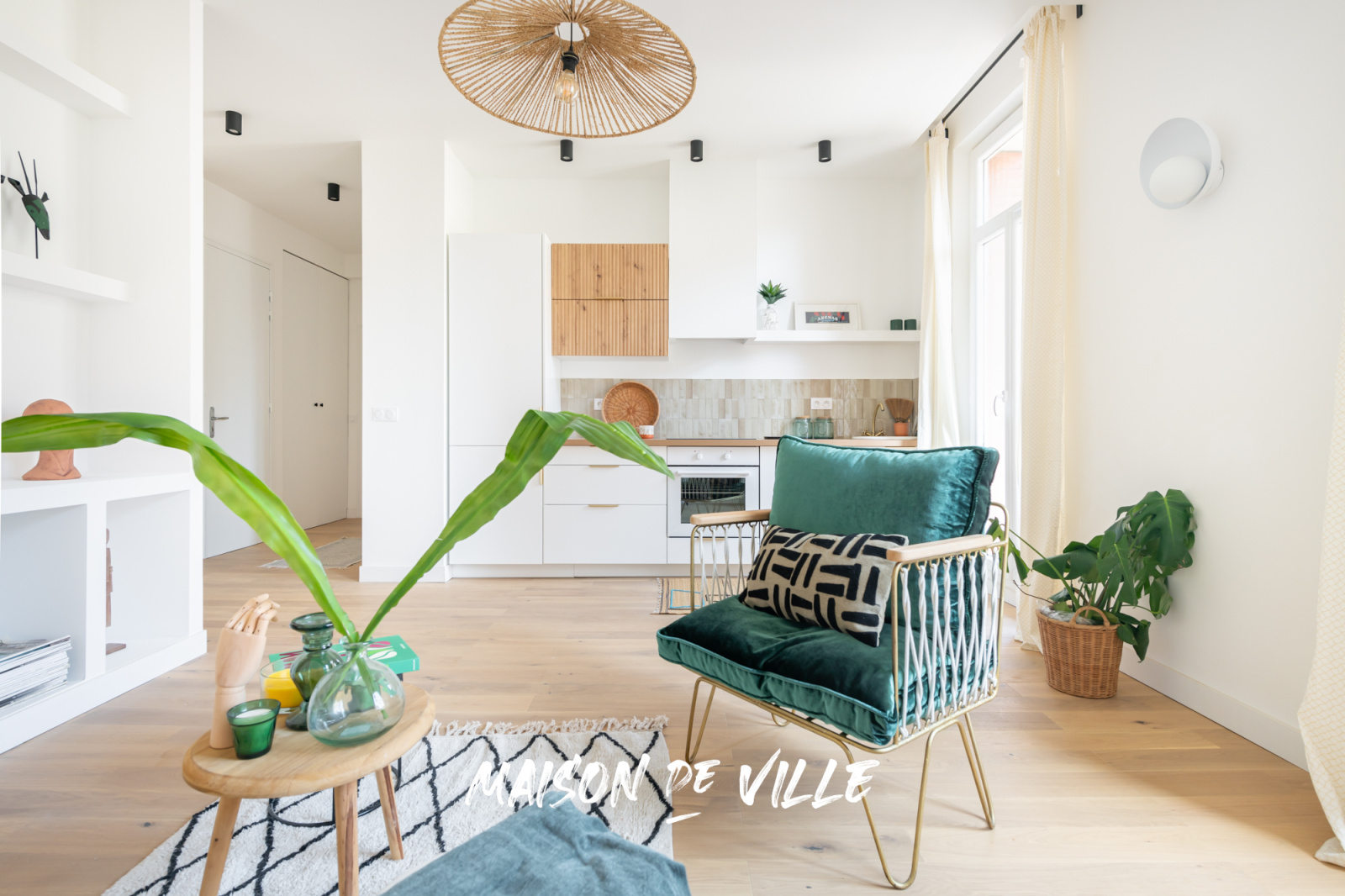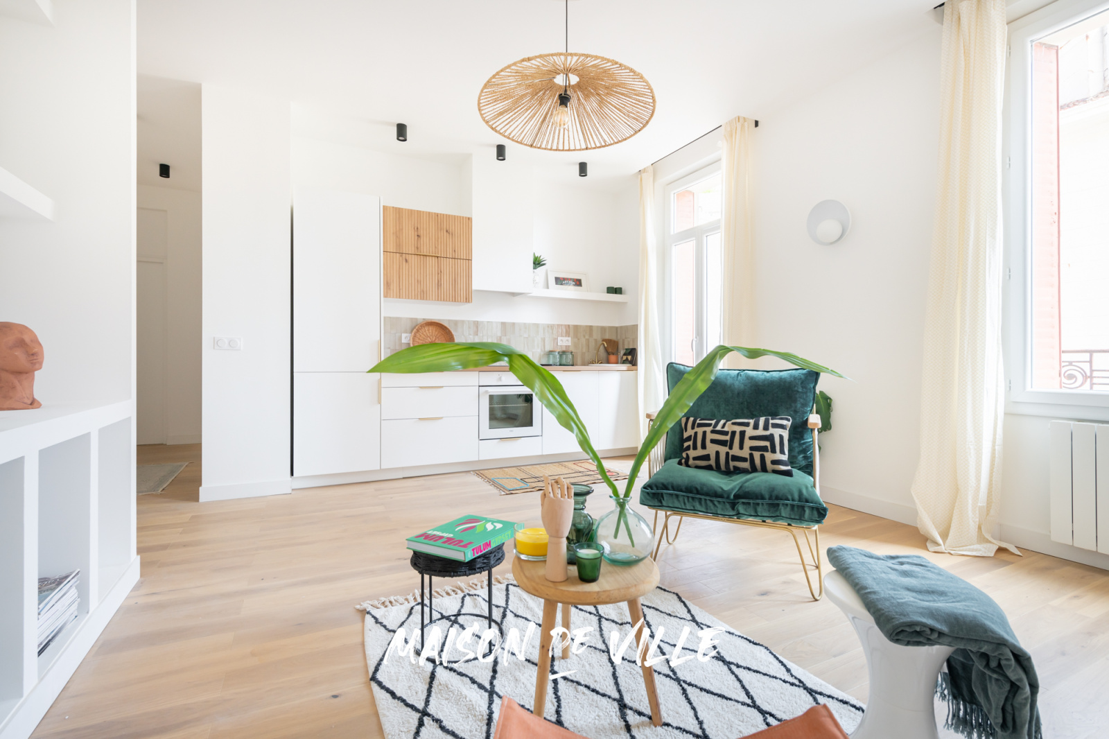 Un joli hall d'entrée avec bibliothèque maçonnée, une cuisine ouverte sur un salon spacieux et lumineux avec accès balcon, une belle salle d'eau et un WC séparé.