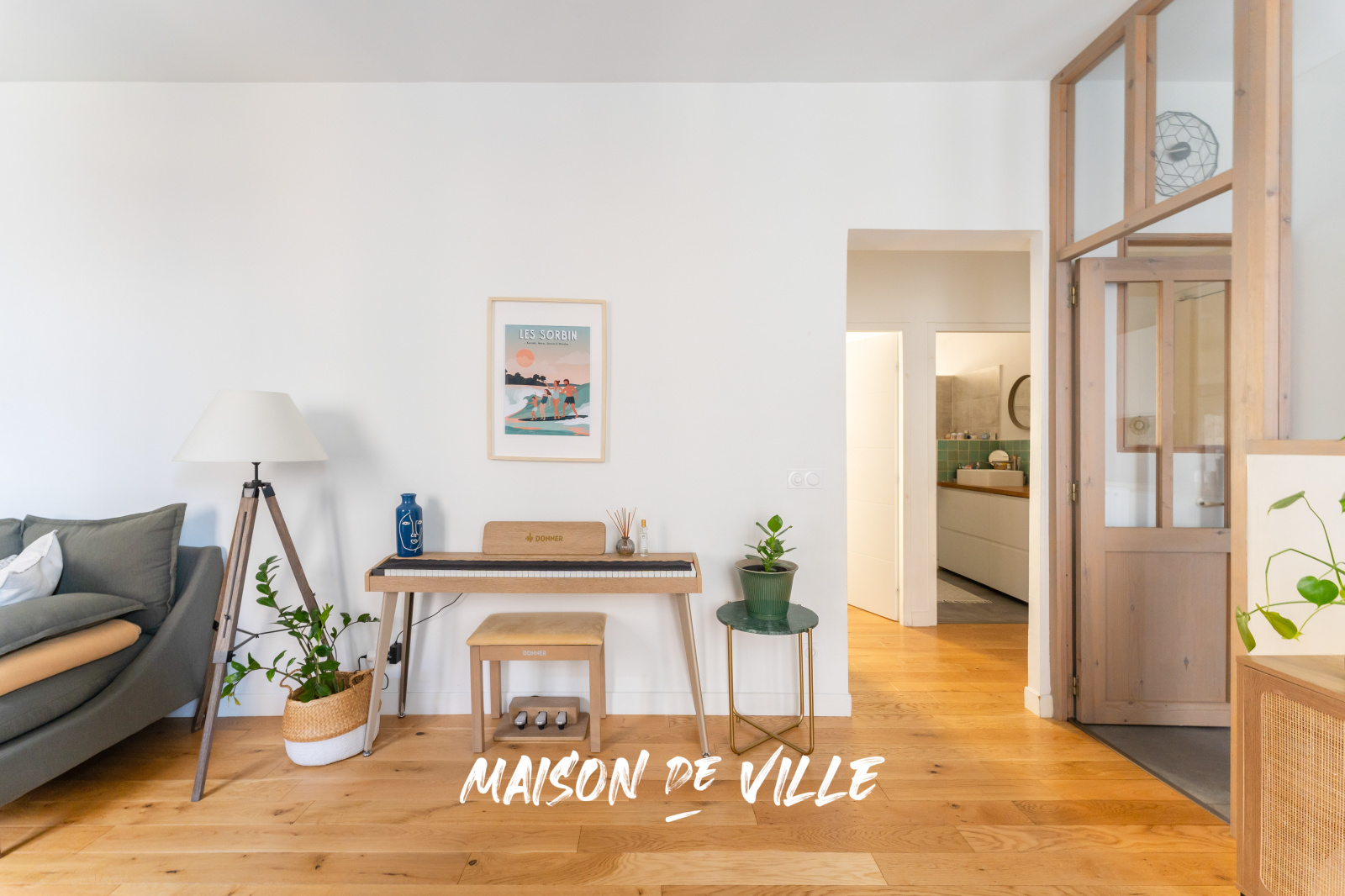 Le coin jour se développe avec une cuisine fonctionnelle et équipée, séparée de la pièce de vie par une jolie verrière. Littéralement baigné de lumière, l’espace salon / salle à manger sera parfait pour accueillir famille et amis.