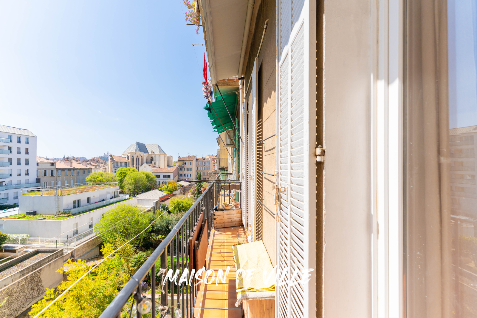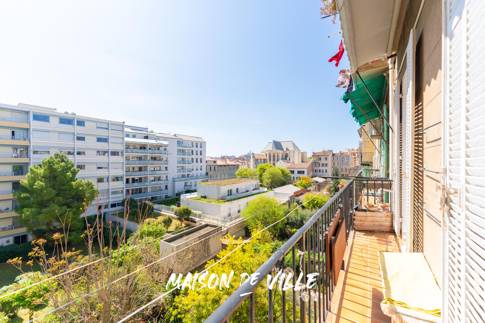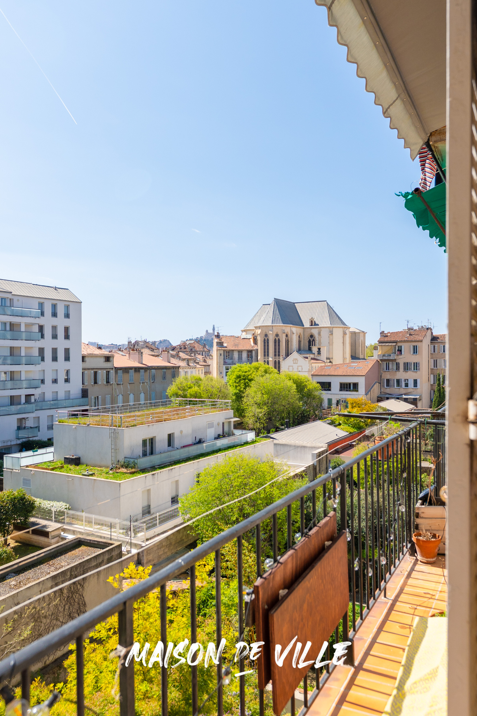 Coté pièce de vie, le séjour lumineux s'ouvre sur un balcon exposé plein sud, offrant une vue dégagée sur l'église Saint-Michel et la majestueuse basilique Notre-Dame de la Garde.