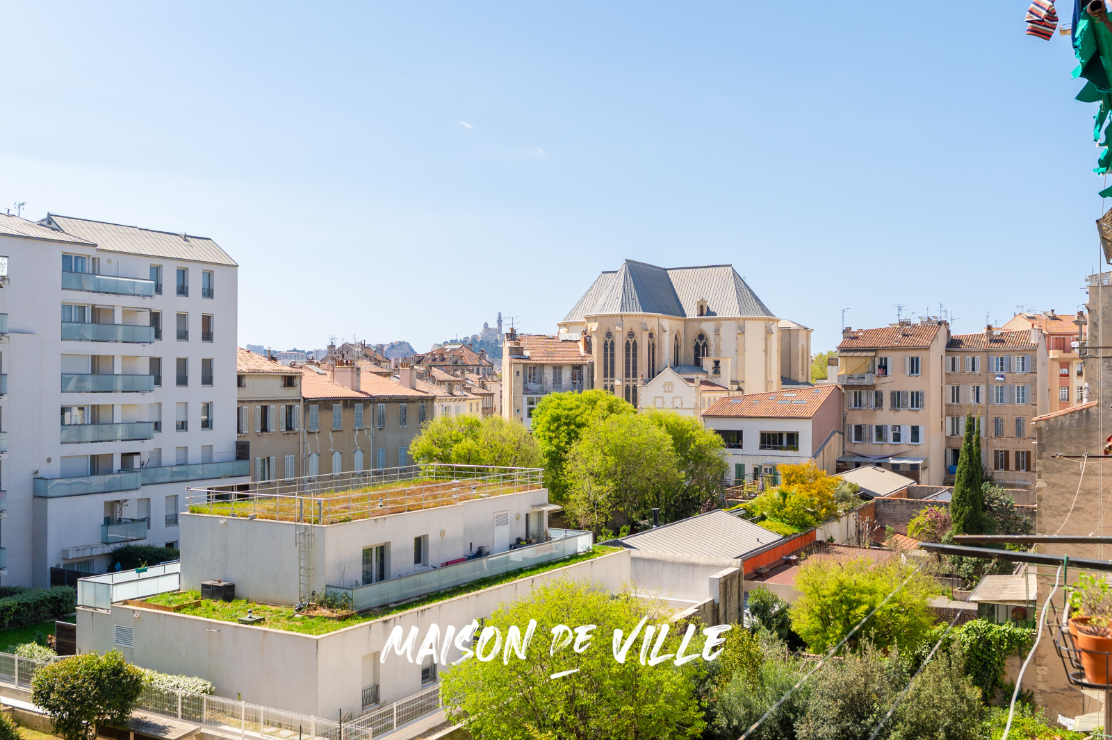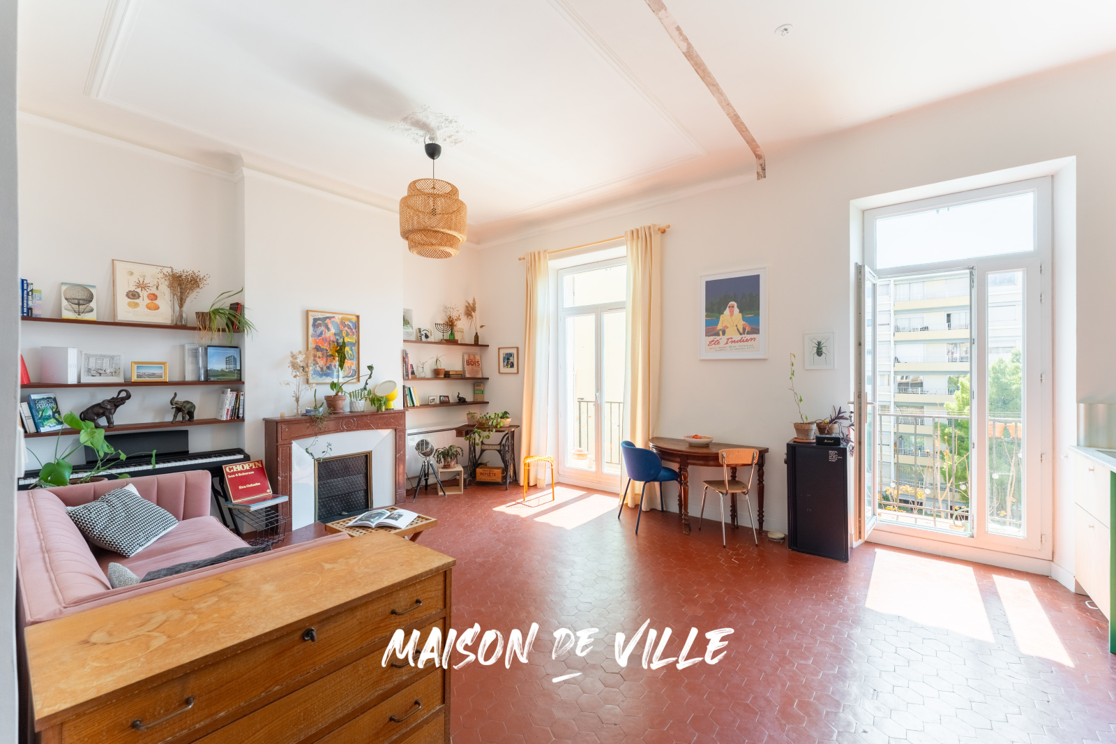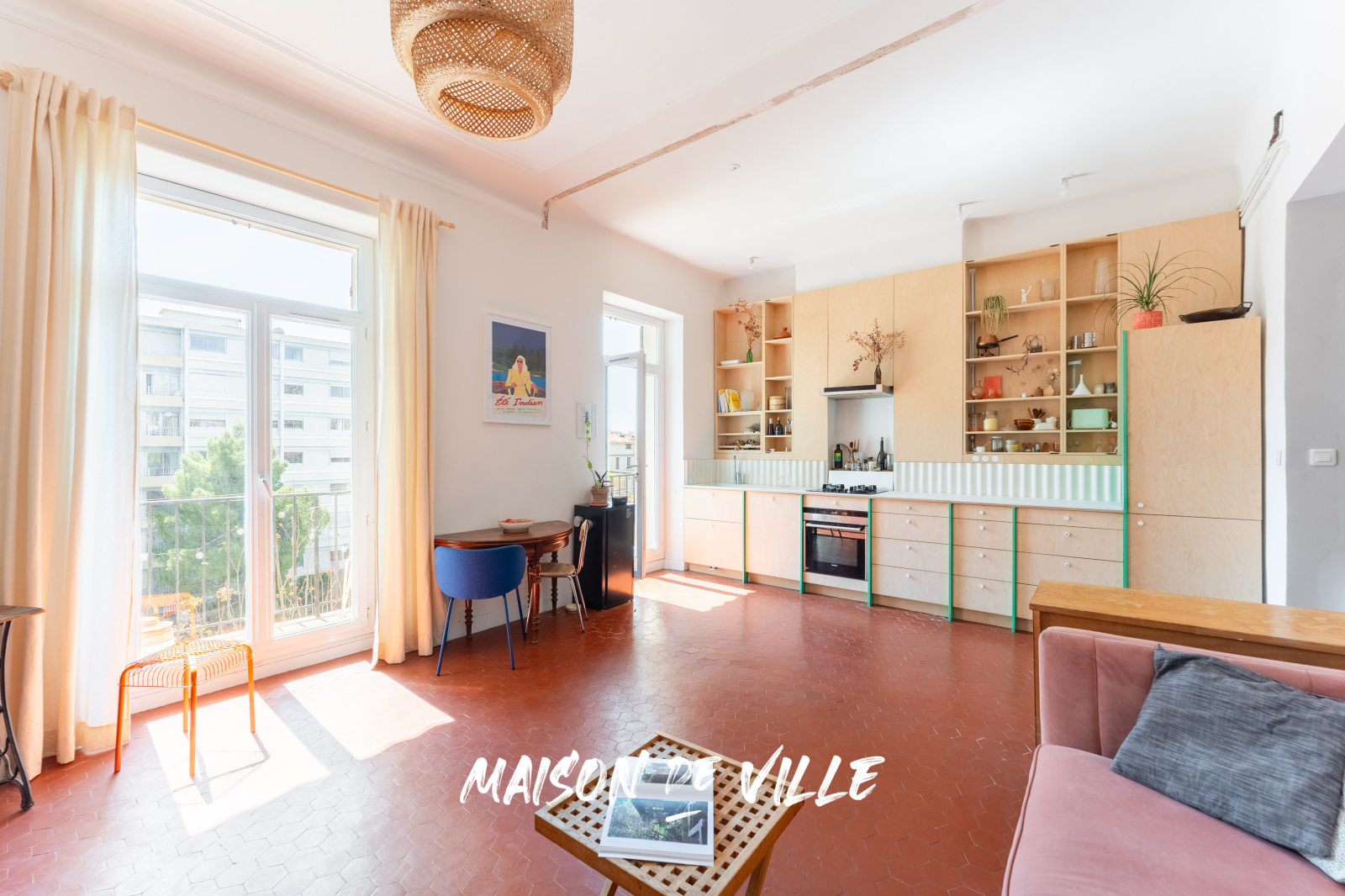 Coté pièce de vie, le séjour lumineux s'ouvre sur un balcon exposé plein sud, offrant une vue dégagée sur l'église Saint-Michel et la majestueuse basilique Notre-Dame de la Garde.